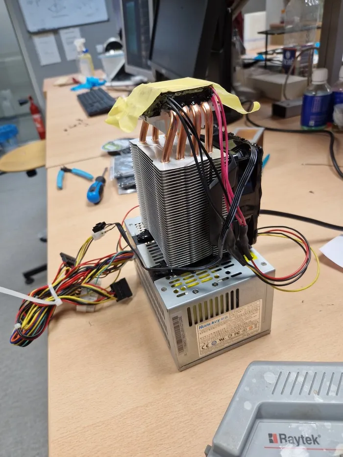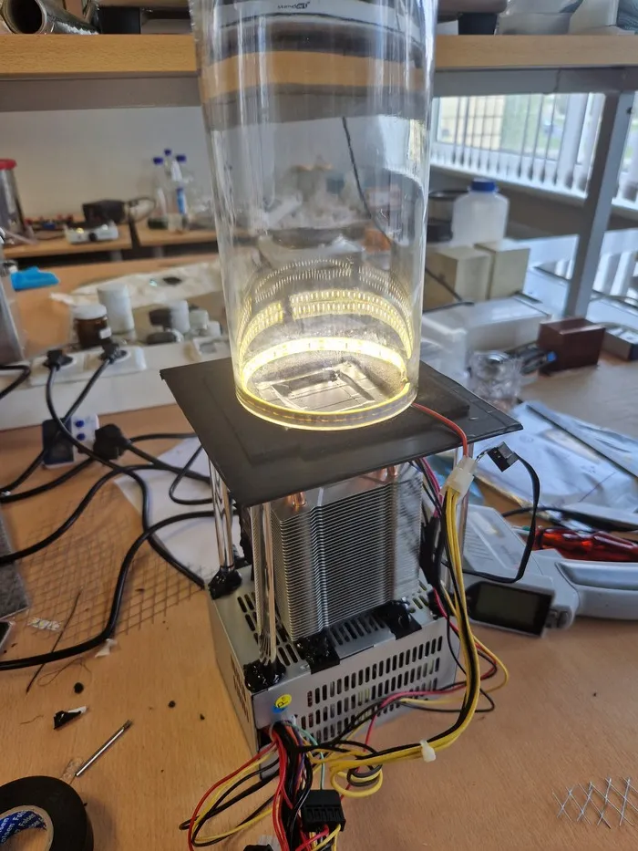 Many alpha, beta and gamma rays fly around us every day, but we don’t see them. Luckily, we can build a cloud chamber, that would help us see those particles. When an alpha or beta ray pass through saturated alcohol vapor they leave ionization trails. If we grossly oversimplify what a cloud chamber is we could say that it is an apparatus that maintains saturated alcohol vapor. To do so first we need a cold surface, to get the alcohol vapour to condense when it touches it. By using Peltier modules that when plugged in make one side very warm and the other very cold, we can create a cold surface. I placed the hot side on the bottom and attached a CPU cooler to it to disperse the heat and by dispersing it allowing the top to be even colder. Also on the cold side I added a copper plate to make the cold surface bigger. Furthermore, I added a high voltage generator to create an electric field which helps to attract alpha and beta rays. To make everything look more aesthetically pleasing, I cut out acrylic supports, put a black sticker on the cold surface and added an LED strip. To prevent the vapour from escaping we add a vase on top of our cold surface. Finally, I connected a power supply to power the fan on the CPU cooler, LEDs and high voltage generator. Now we are finished with our cloud chamber that works very nicely. To use it, we plug it in, pour some alcohol onto our cooled surface and wait. After some time we should start seeing particles passing through the vapour. This project was inspired by The Thought Emporium’s video.